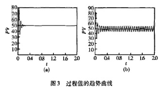 理想情況下,控制閥的摩擦引起的非線性是忽略的,其過(guò)程的趨勢(shì)曲線如圖3(a)所示。采用圖1所示的反饋控制,控制器使用常規(guī)的線性PID控制,調(diào)節(jié)閥為氣動(dòng)調(diào)節(jié)閥,使用數(shù)據(jù)驅(qū)動(dòng)模型來(lái)模擬實(shí)際的控制閥,數(shù)據(jù)驅(qū)動(dòng)模型的參數(shù)設(shè)置為:S=5,J=2。其中S表示死區(qū)加粘連,J表示滯跳。通過(guò)仿真來(lái)得到PV和OP的時(shí)間序列,為分析控制閥的非線性提供數(shù)據(jù)。由于控制閥的模型是非線性的,導(dǎo)致整個(gè)控制系統(tǒng)是非線性的,而采用的控制器是線性的,這種非線性導(dǎo)致過(guò)程出現(xiàn)震蕩(15),其過(guò)程值的趨勢(shì)曲線如圖3(b)所示。